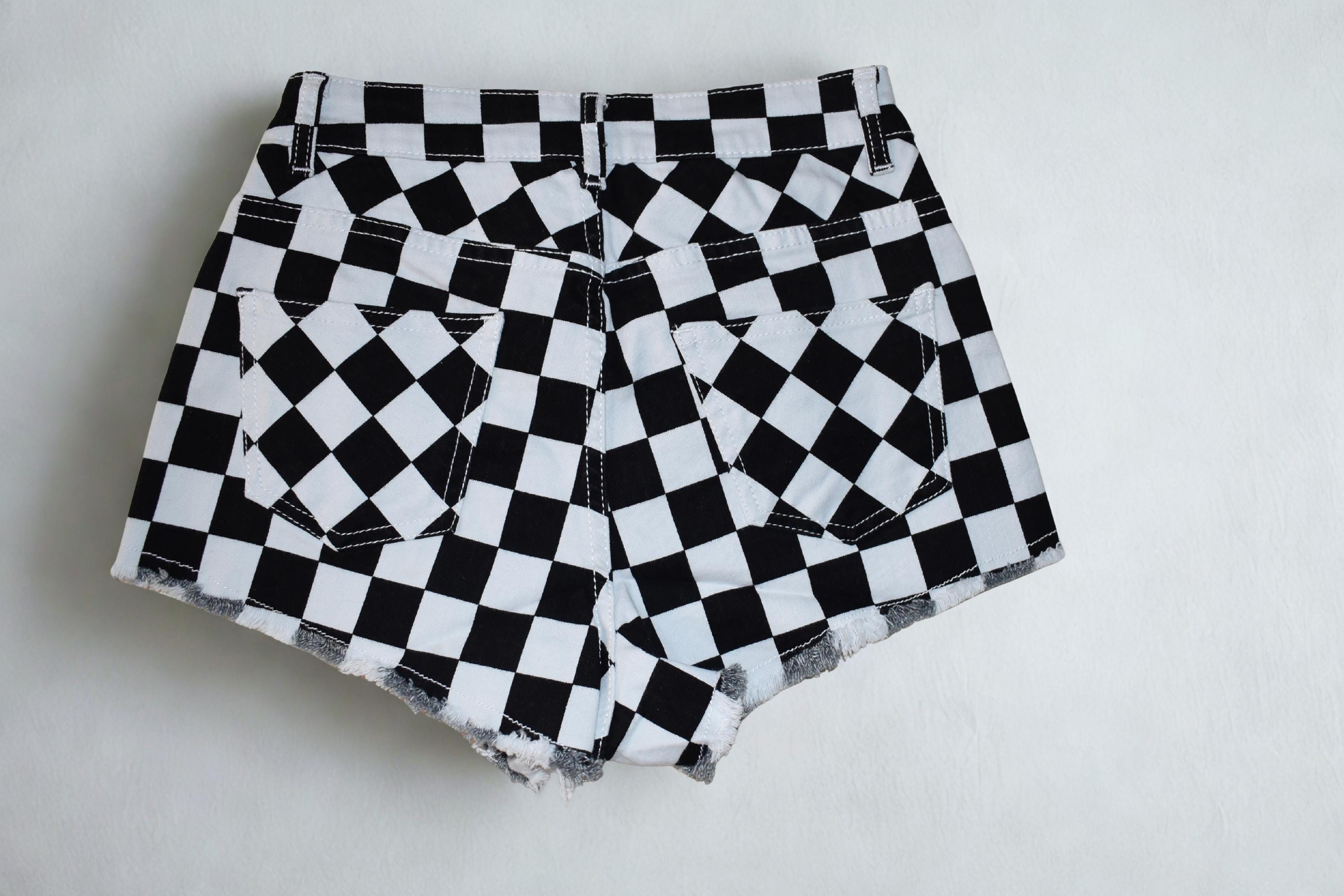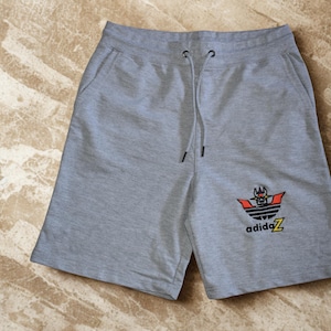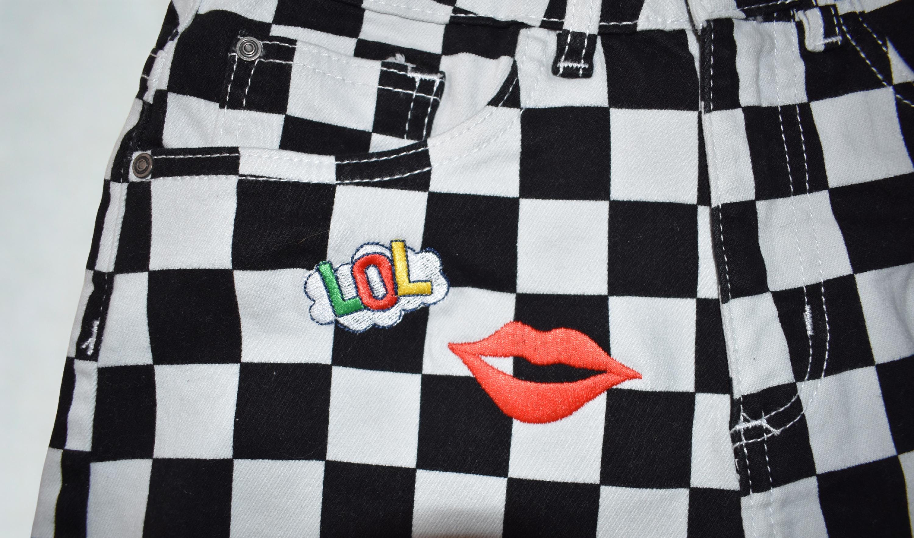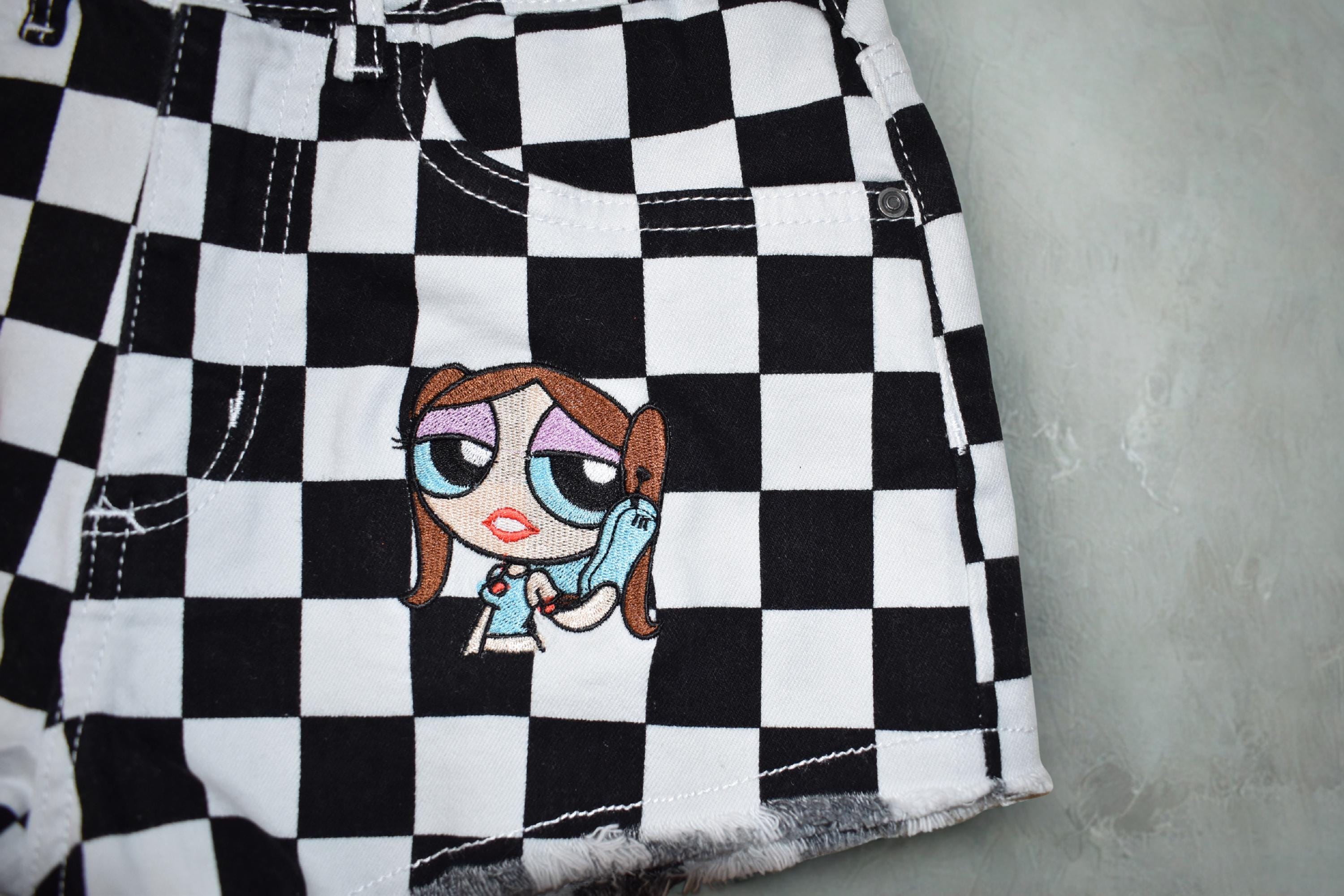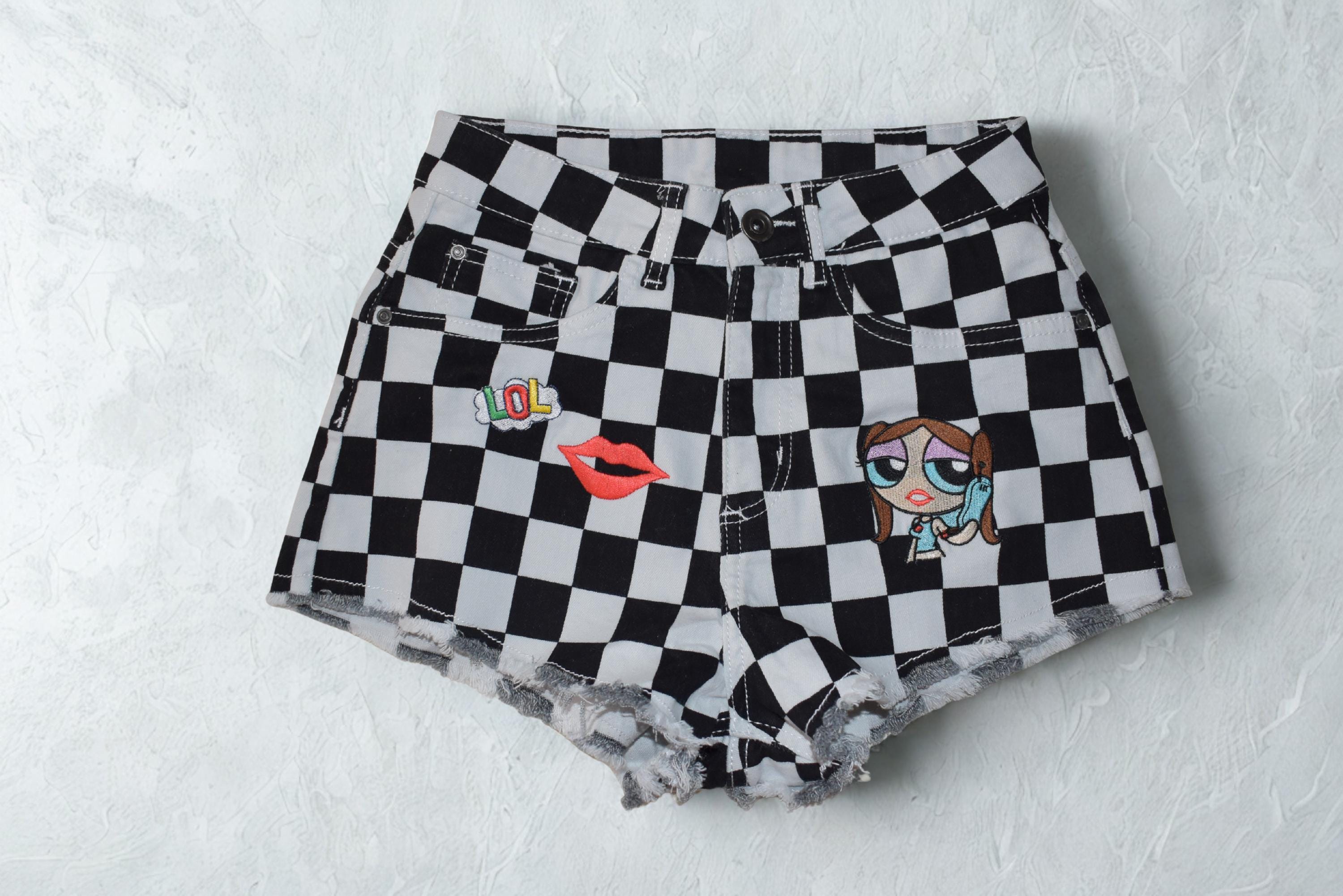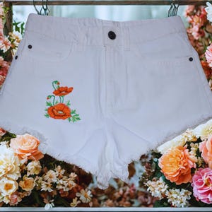 White denim shorts, 100% cotton. Raw, frayed hem. Poppy flower embroidery on the right leg. Size: 26.