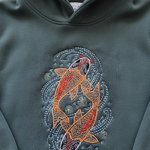 - Embroidery size: [ 27 x 27 cm ] - Technique: Embroidery on fabric - Base material: Fabric [80% cotton and 20% polyester, three-layer with hood and flat drawstring, set-in sleeves, neck tape, brushed interior, side-seam construction] - Yarns: Isacord 100% trilobate polyester fibre which guarantees shine and resistance