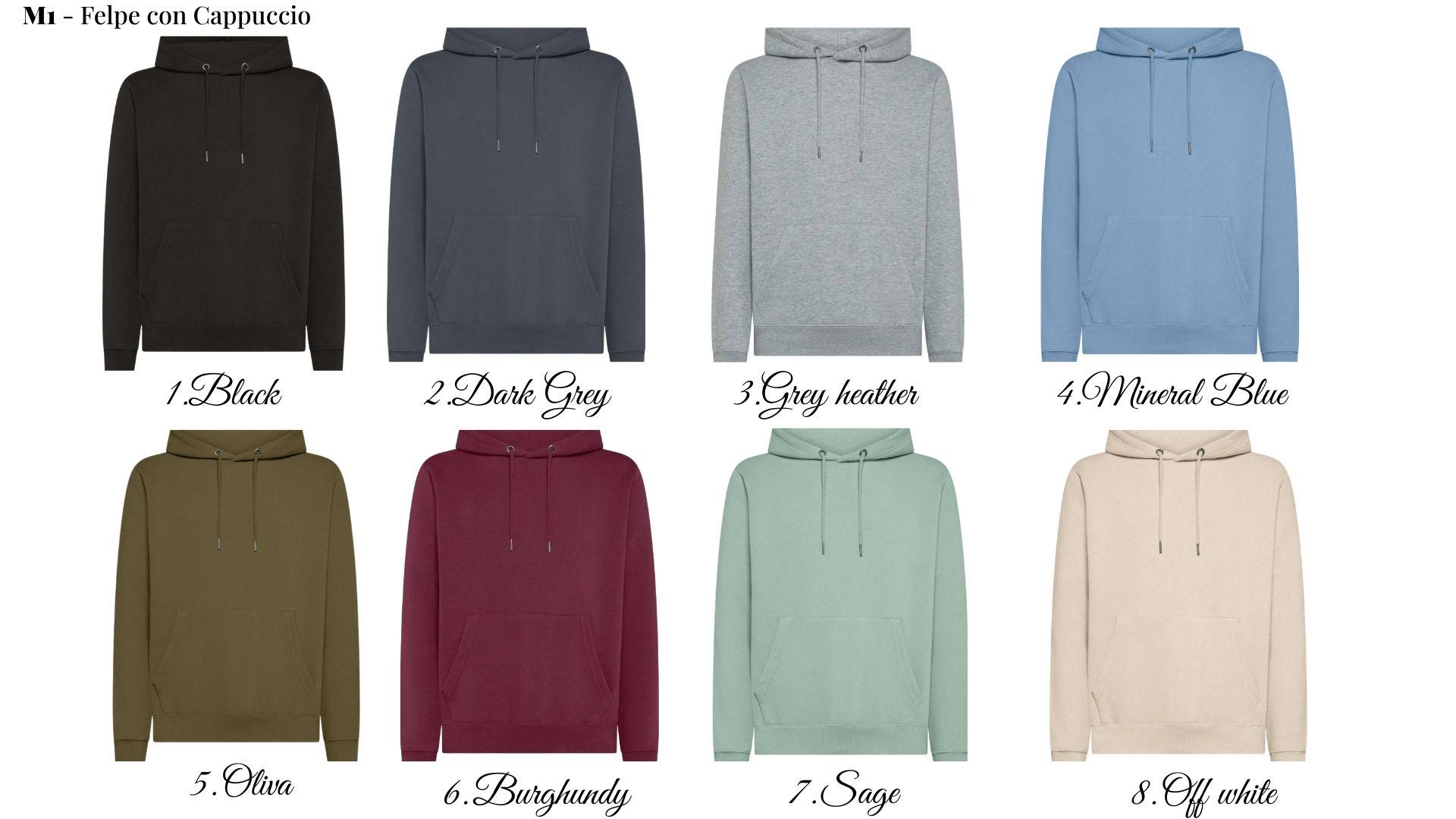 MATERIALS & MODEL > M1. Unisex set-in sleeve sweatshirt with double-layer hood, metal-tipped eyelets and drawstrings, large kangaroo pocket, side-seam construction, ribbed waistband and cuffs.