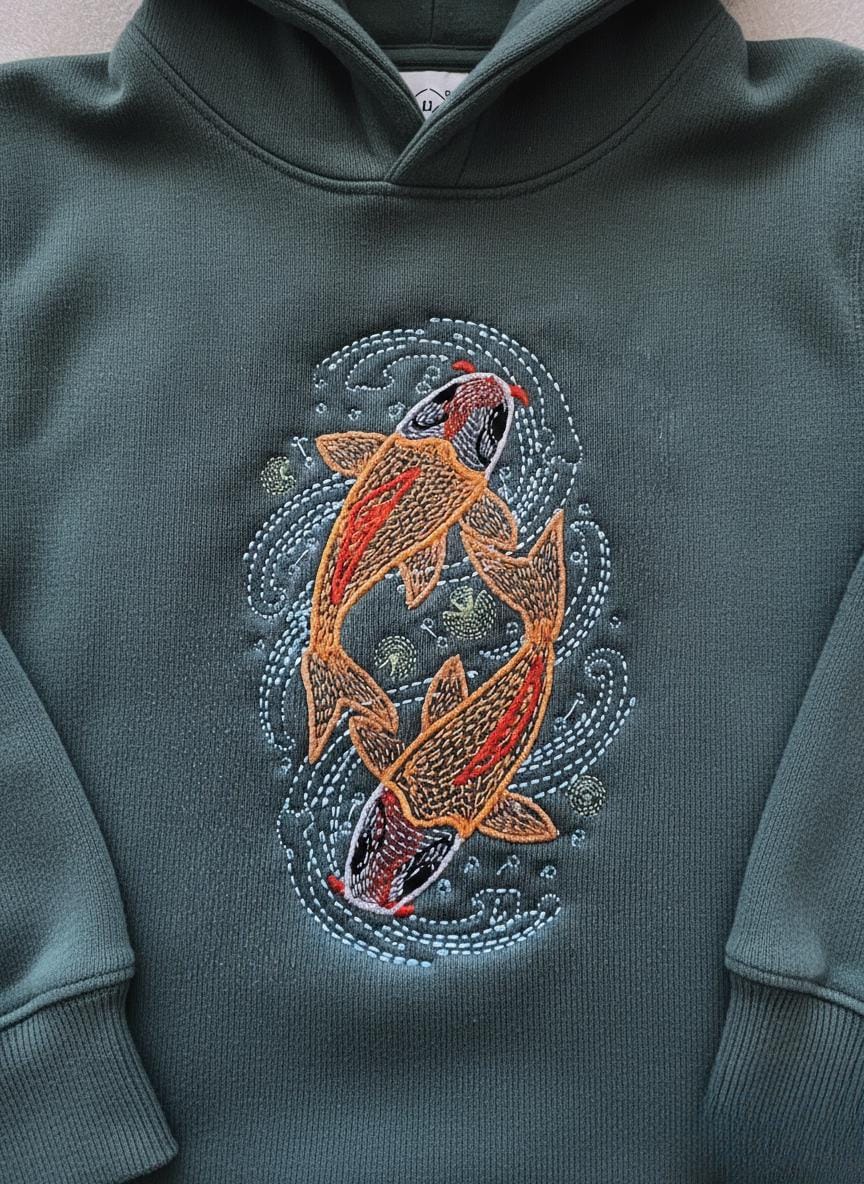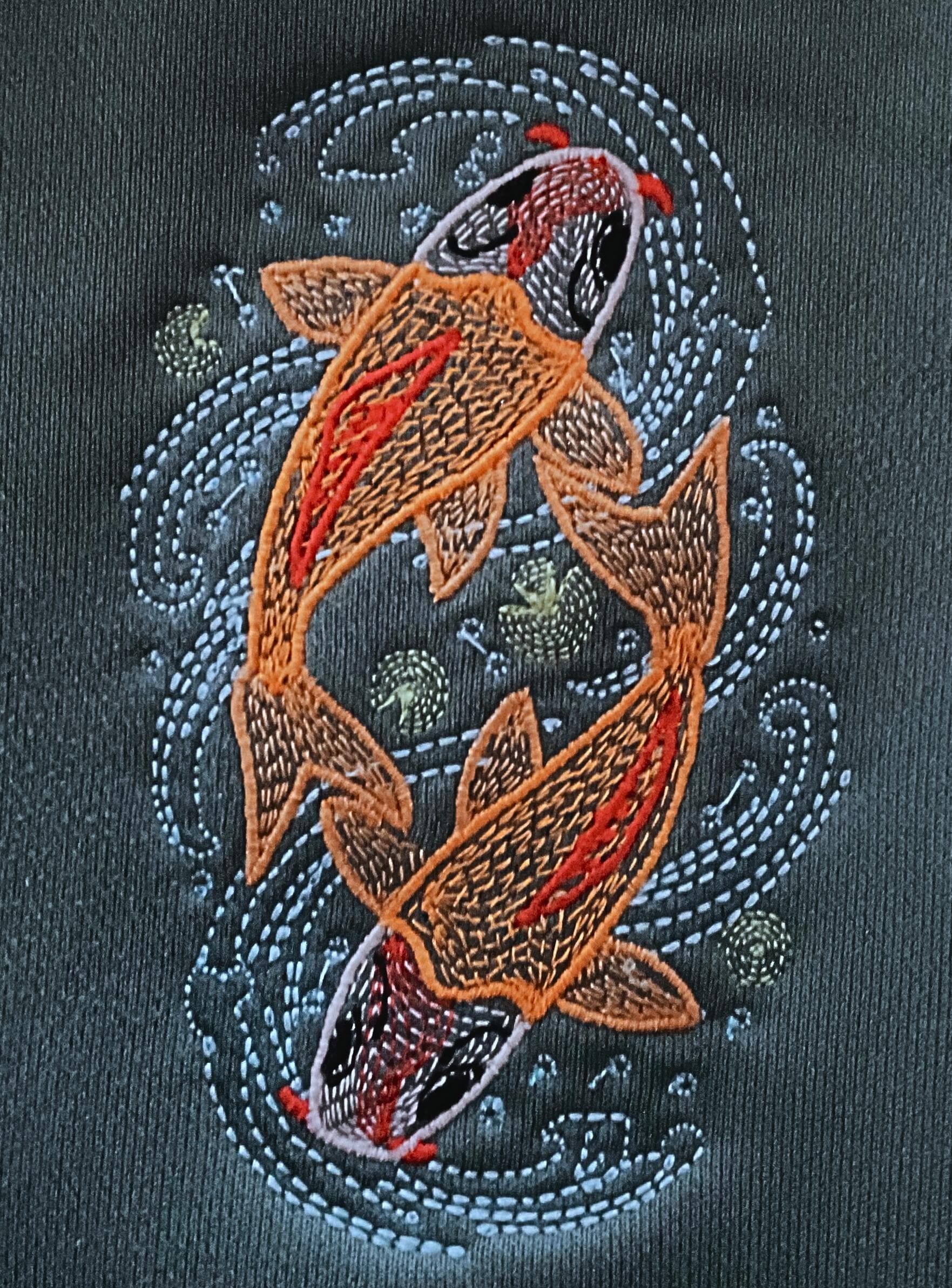 Like Yin and Yang, embroidered Koi carp tell a story of balance and fortune. A small masterpiece of texture that exudes a sense of determination.